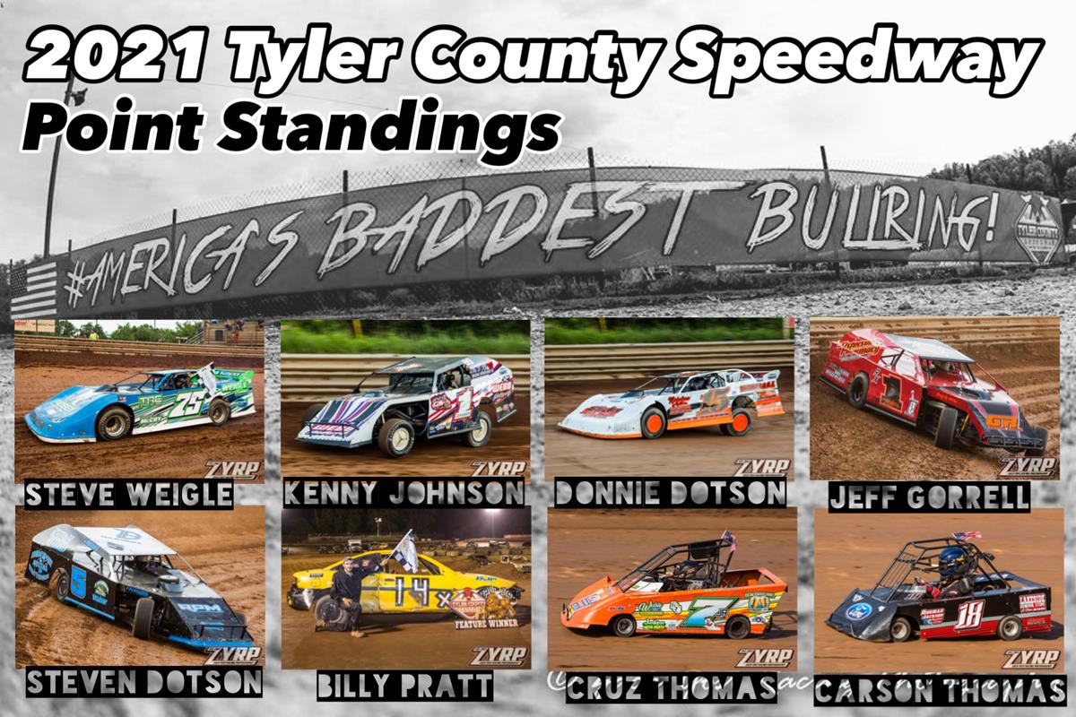 Congrats to Steve Weigle, Kenny Johnson, Donnie Dotson, Jeff Gorrell, Steven Dotson, Billy Pratt, Cruz Thomas and Carson Thomas for leading the points at America's Baddest Bullring at the midway point.