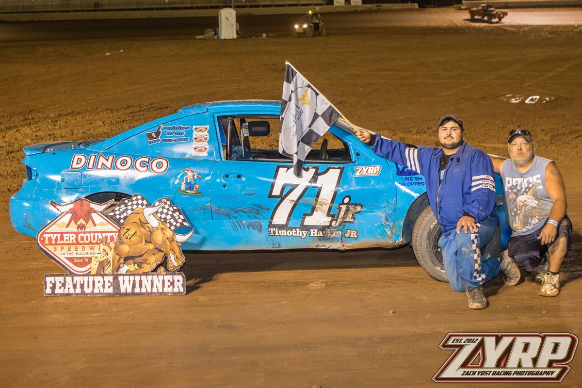 Timothy Harlan Jr. would go back to back in the Dinoco #71 in the Bullring Bomber division. A great race long side by side battle between Harlan and Jason Frazier would entertain fans but at the line it was Harlan followed by Frazier, point leader Jake Tidd, Mike Todd and Harvey Wells.
