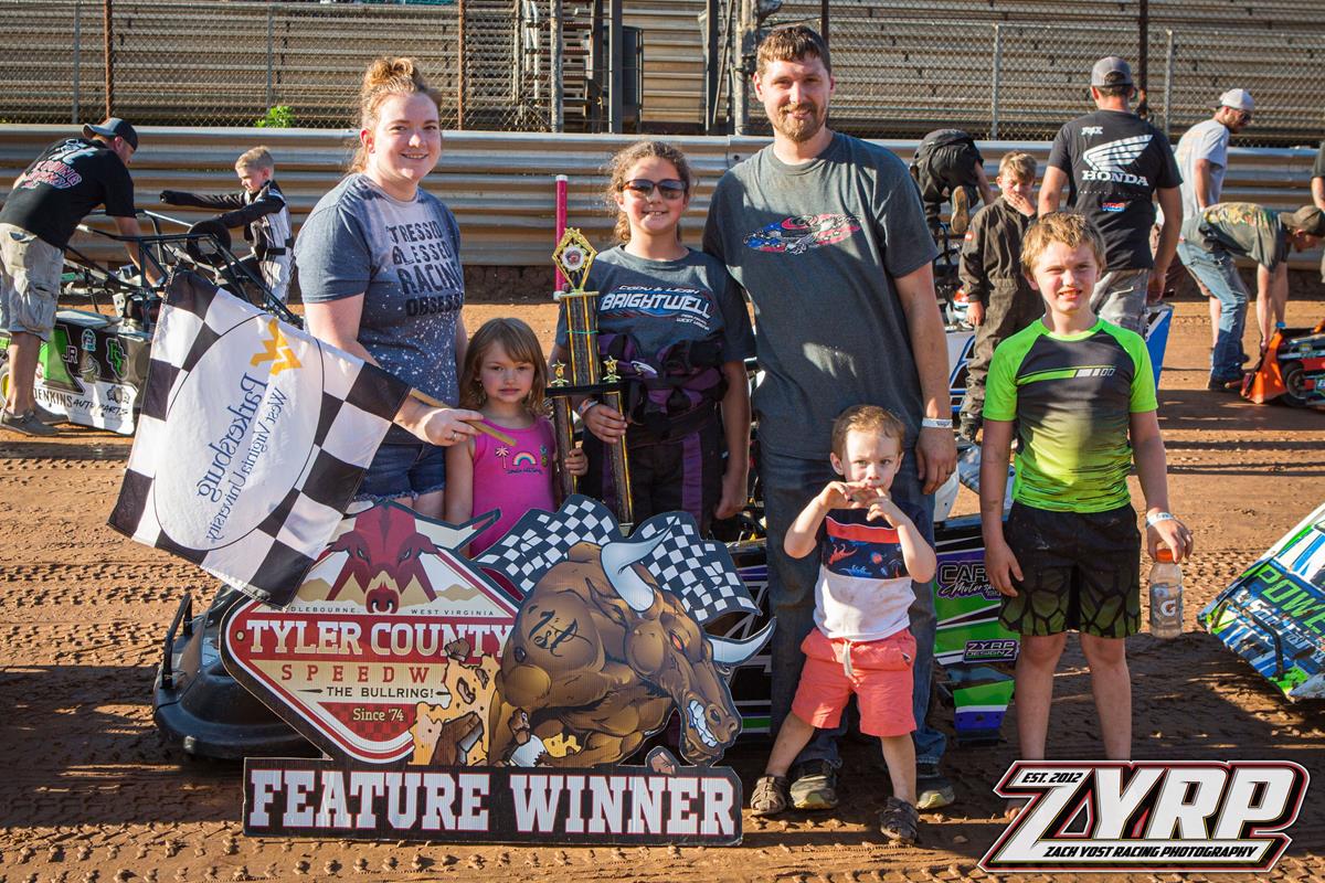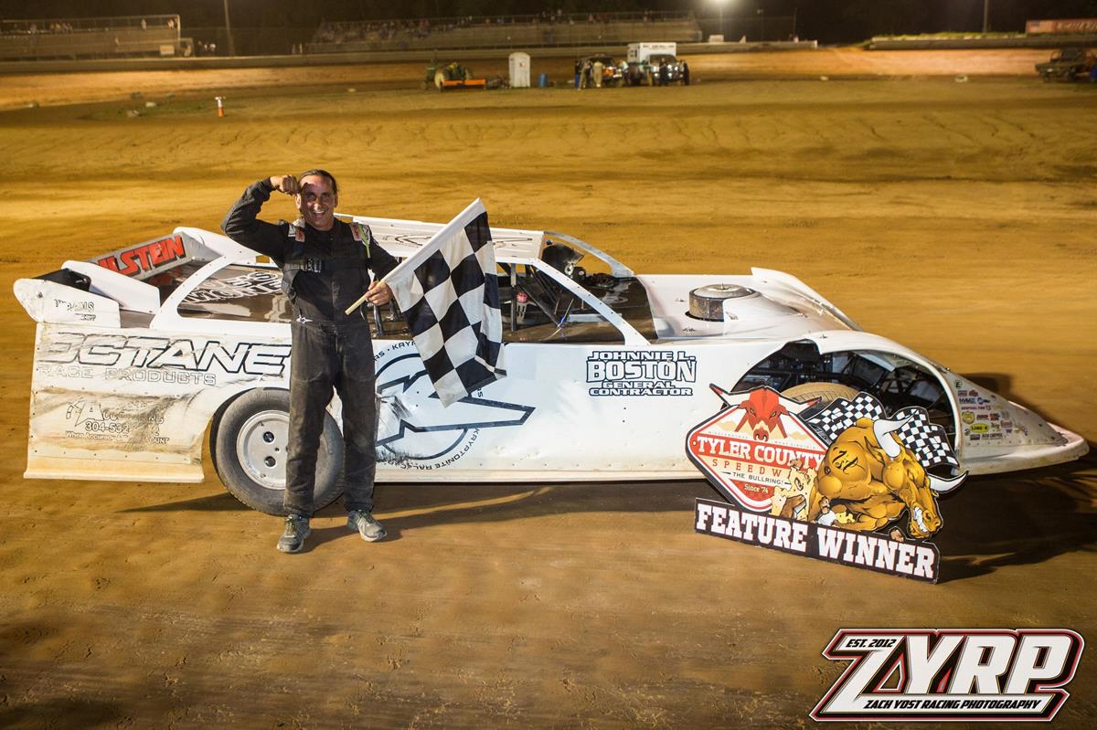 The ‘Flattop Flyer’ Kendall Hodge and current point leader would garner his 4th trip to the West Virginia University of Parkersburg Victory Lane at Tyler. Hodge would turn back all challenges enroute to the checkered flag besting Steven Dotson, Ryan Payne, Cruz Vandall and Sonny Leek.